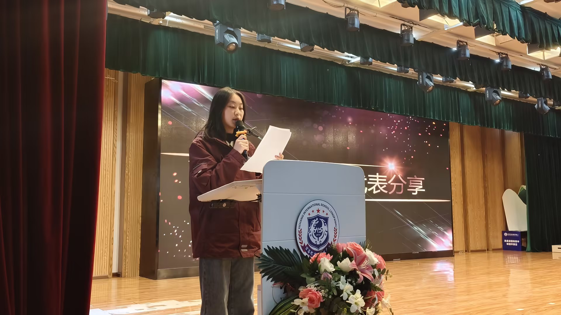 大会伊始,学校为在学业、研学及日常表现中优异的学生颁发了多项奖项。2501班陈彤心同学作为学生代表,分享了适应国际课程的心得,讲述了如何通过词汇积累、跨学科学习和参与学生会工作实现自我突破。